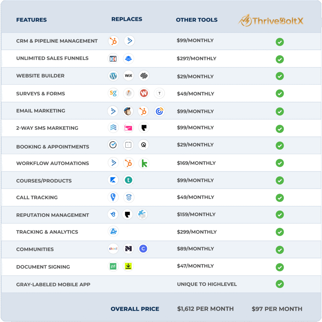 All The Tools You Need In One Platform The Thriveboltx Platform is everything that marketers need to manage their leads, websites, funnels, calendars and many other services that are needed to maintain a customer.